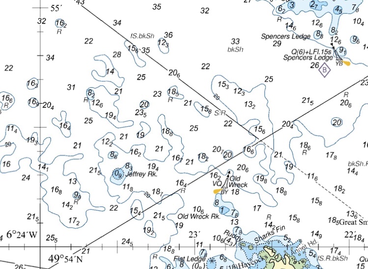 Longitude is shown similarly horizontally across the charts. Note that because this chart is of an area west of Greenwich, the numbers increase from right to left. We can see 6˚24’W marked in full, with 23’ and 22’ also shown. The longitude of the buoy is 6˚22.8’W.