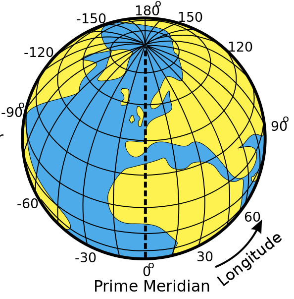 By contrast, lines of longitude run from the North Pole to the South Pole. There is no natural line of zero longitude, but by convention, Greenwich is defined as longitude zero. Points to the west of Greenwich have a westerly longitude (e.g. 30˚W) and points the east have an easterly longitude (e.g. 10˚E). G