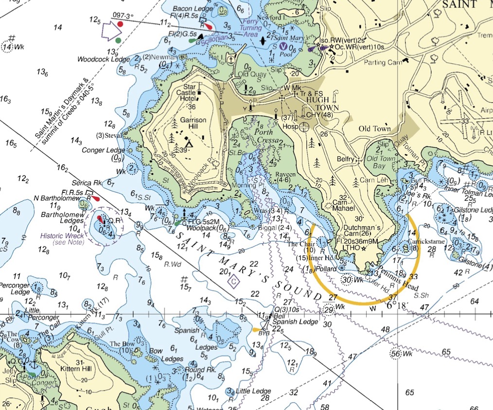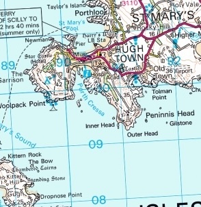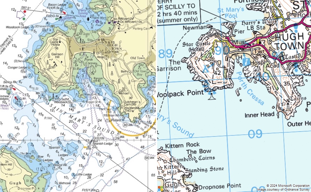 For comparison an OS map and a nautical chart of the same area are shown below:
