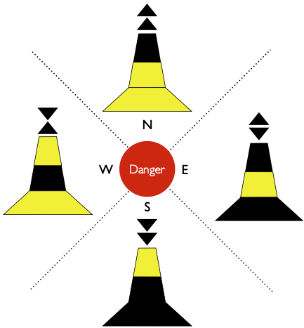 Wiggly lines on charts, looking like waves, are used to indicate areas of rough water. Arrows are used to indicate tidal stream directions. Buoys are illustrated on charts using symbols that look like the shape of the buoy.