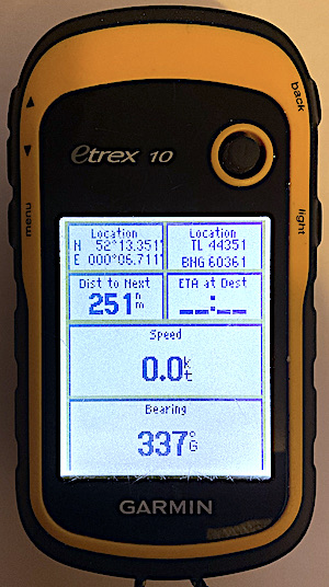 If you end up faced with an abnormally long OS grid reference, simply ignore anything after the first 3 figures of the northing and easting to give yourself an understandable 6-figure gird reference. For example, the GPS unit in the photo above shows ‘TL 44351 60361’. I’ll read off TL 443 603, which is a 6-figure grid reference that I can reference to a map easily.