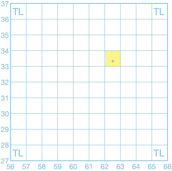The reference numbers on OS maps only go from 00 to 99. This is a problem as OS maps have to cover the whole country, which is larger than 100 km x 100 km! To solve this problem the country is divided up into 100 km squares, each referenced by 2 letters. You’ll find these letters at the corners of OS maps, or at the edges of the squares, when these appear on a map. Our grid above is entirely in the ‘TL’ 100 km square, so we can provide a gird reference for our square of ‘TL 62 33’. In practice, the letters can be omitted if it’s clear roughly where the location is.