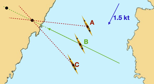 The easiest way to do this is to look for two objects at the planned destination, one behind another, that line up. If these objects stay aligned, the kayaker must be on track (B). If the kayaker is too far the the right (A), the further object will shift to the right. If the kayaker is too far the left (C), the distant object shifts to the left.
