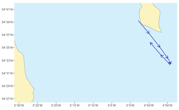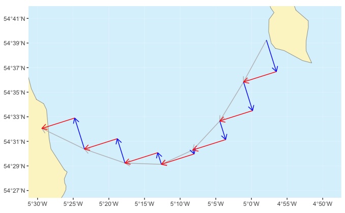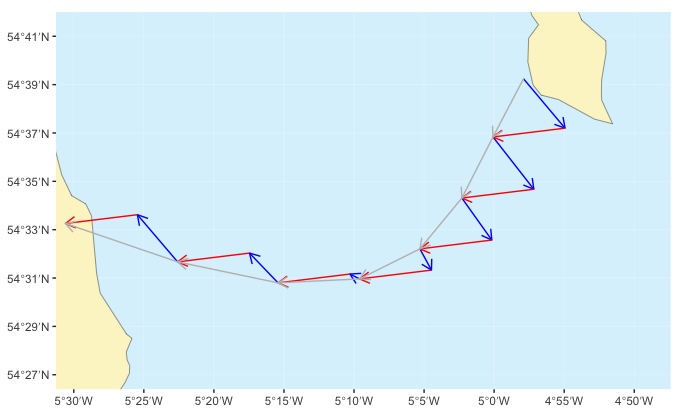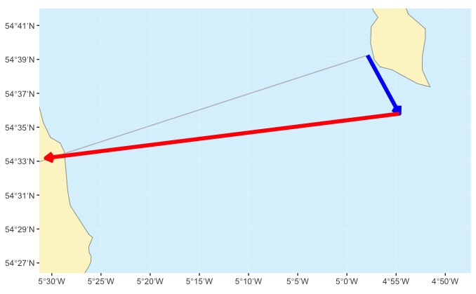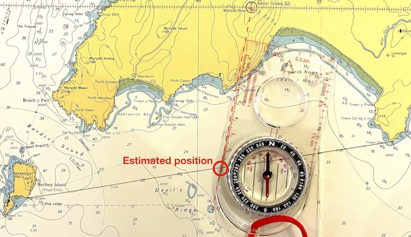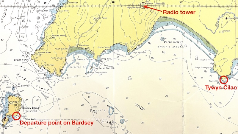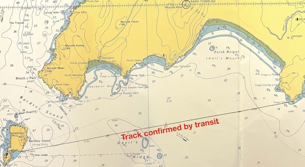 Given you’re following a transit from Bardsey to to Tywyn Cilan, you can be sure that you’re on a straight line between your start and finish points. You might have already sketched this line on your chart before leaving the island: