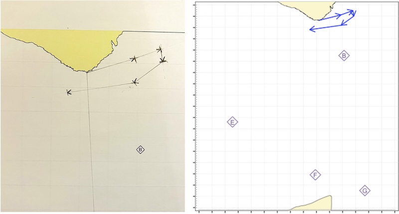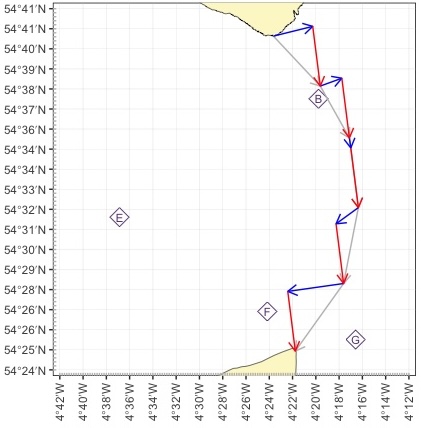 This information could be useful if we need to change our plans during the crossing. For example, if a problem occurred after 1 hour, we know that it will be quicker to turn back, or head to the coast on a bearing of 220˚ rather than continuing on our planned crossing.