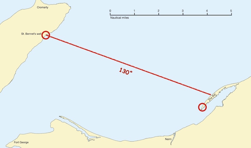 The coast east of Nairn that we are heading for is fairly low-lying, so The Bar will likely not be an obvious feature. We choose to aim off a little to the north, so that we can paddle south-west down the bar after we meet the shore to reach our camp spot.