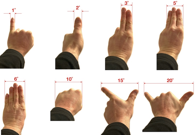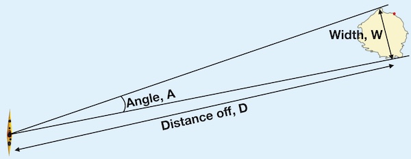 The angle can be measured by comparing compass bearing to either side of the object, but what makes this method practical for use in sea kayak is that angles can be estimated from holding your hand out at arms length: