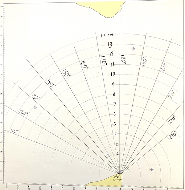 To make things easier, it helps to do some pre-work with your chart. Marking the chart with a ‘spider’s web’ of bearing and distance information allows to see at a glance where you are from a GPS bearing and distance to travel.
