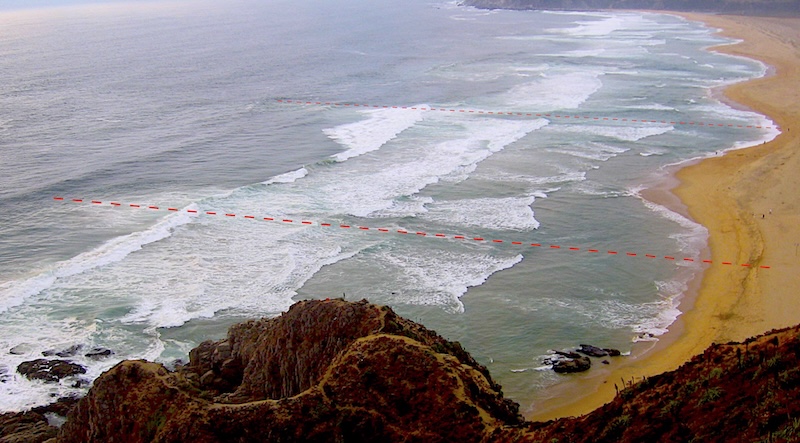 Waves don’t always meet the beach exactly perpendicular and the returning water current can have a component parallel to the beach. As a result, there is often a current running along a beach. This current doesn’t normally run very fast, but it can displace groups of kayakers playing in the surf from their start point. To keep the group together, it’s often helpful to pick a landmark on or behind the beach to try and stay opposite.