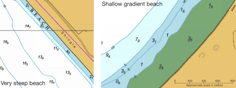 Beaches with shallow gradients typically have a long distance between the waterline at high water and low water. So while they might form nice safe surf, there can be along distance to carry the boat if you happen to be there at low tide. This may enable you to identify shallow angled beaches from a chart or a large scale OS map - look for a large green drying area on the chart. Steeper beaches can be recognised on the chart by the water becoming deep close offshore.