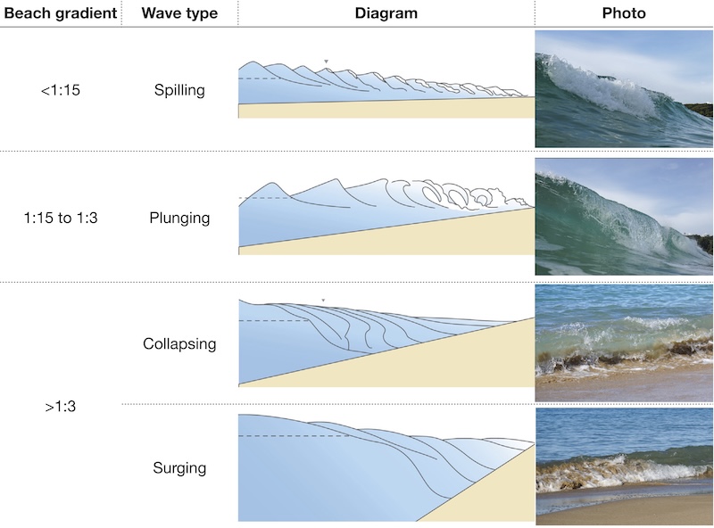 Spilling waves break slowly on beaches with a shallow gradient, losing their energy over an extended distance. These are often enjoyable waves to surf in a sea kayak. On steeper beaches, the waves become steeper too, losing their energy more rapidly. The top of the wave starts to curl over, creating a plunging wave. Plunging waves are sought out by experienced surfers, as they tend to be steep and powerful, but they tend to be challenging to surf into a long sea kayak.