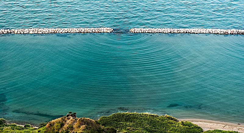 Waves will also diffract around islands. Whilst there will be some shelter from the waves behind the island, further out there may be an area where waves diffracted from either side of the island meet each other and cause a confused wave pattern that may be difficult to paddle in: