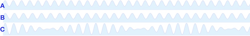At (A) the waves are in still water, moving from the left hand side of the image towards the right. The tidal stream increases towards the right hand side of the image. As the waves enter the faster stream, they’re squeezed together (B), reducing their wavelength. This has several effects: