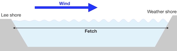 The image below illustrates waves increasing with fetch as the wind blows across a body of water: