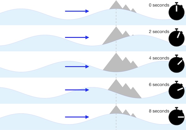 In the diagram, we’re looking at the waves at a few instants in time, separated by 2 seconds. In the top image, we’ve started a stopwatch when the peak of the wave passes a fixed point - the peak of a distant island. 2 seconds later, the waves have moved to the right. We keep timing and notice that 8 seconds later, the peak of the next wave has arrived at our fixed point. We call the time that the waves takes to pass, in this case 8 seconds, the period of the wave. You can measure the period of the waves easily from your kayak by counting the seconds between being on the crests of subsequent waves.