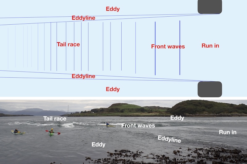 Here we can see the smooth run-in, which no waves can penetrate into and the ordered waves at the front of the race. Further down in the ‘tail race’, the waves are smaller, but more disordered. To make it possible to see all this, I’ve chosen a small race for the image - often these features will be present over a much bigger area.