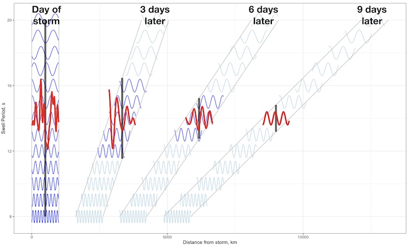 Of course, in reality, the sea state is rarely a single simple swell like we’ve just looked at. Instead, waves come in many different periods and sizes. Waves of each period will have a different stopping speed and hence will stop at a different point in the race as the flow accelerates. The result is that: