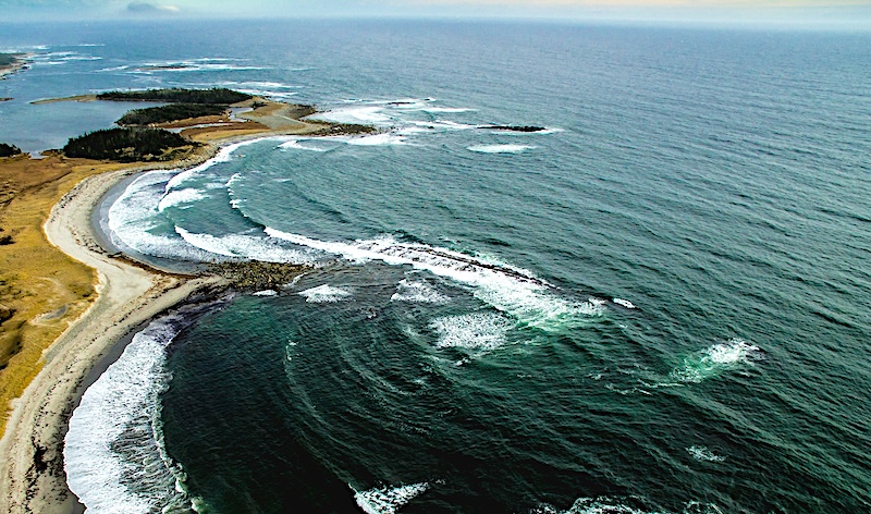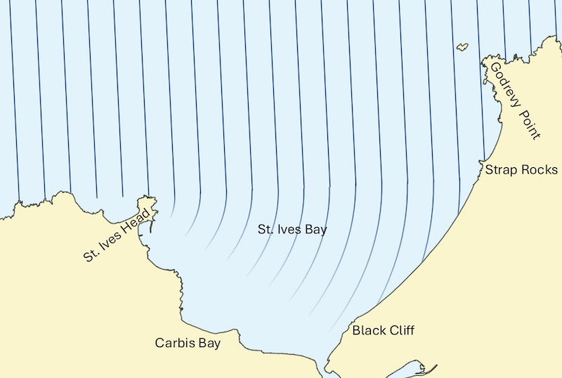 Diffraction of waves depends on wave period. If the swell coming in contains shorter wave periods, we may find that these shorter waves get diffracted less, so that only the longer waves exist at Black Cliff. This might generate cleaner surf than elsewhere on the coastline.