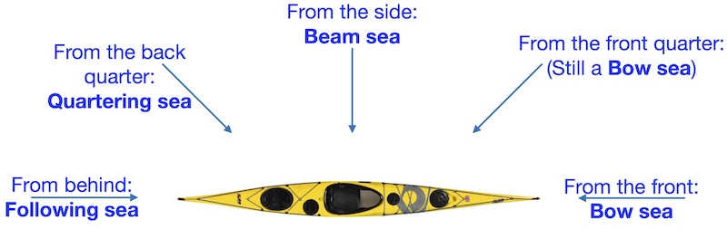Quartering sea: Waves from the back quarter of the boat have all the problems of a following sea with few of the advantages. The boat may still feel tippy to inexperienced paddlers. Keeping the boat straight can now be challenging, as the waves will tend to turn the boat, especially if they are steep short period wind waves.