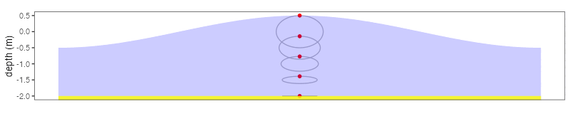Notice that the particles follow a circular path. The circles become smaller with depth - and again, there’s almost nothing happening by the time we get to a depth equal to half the wavelength - 5 meters for this 10 meter long wave.