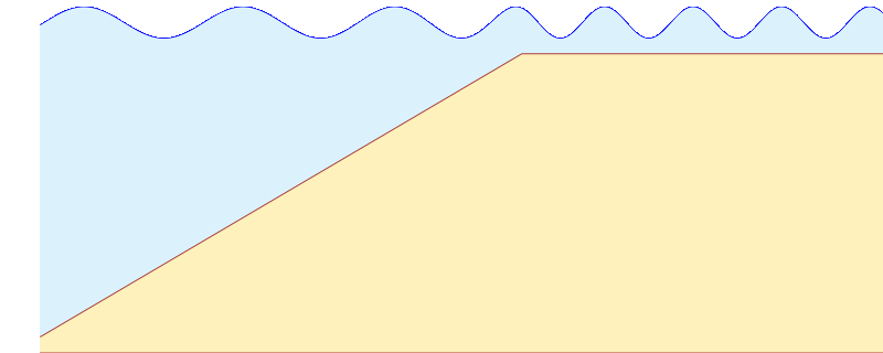 Notice that at the crest and trough, the water is only moving horizontally, whereas halfway up the wave slope, the movement is only vertical. And notice how for this 10 meter long wave, there’s almost no movement at water depths greater than 5 meters - i.e. half the wavelength.