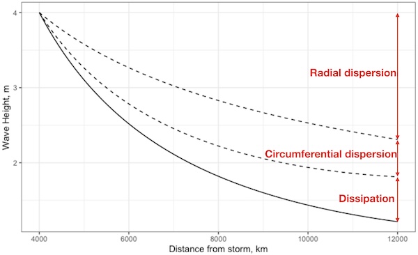 What happens to swell as it crosses an ocean? Clearly, the waves that reach Cornish beaches on a summer’s day are different to the chaotic sea state that existed in the ocean storm that formed them. So how do waves become smaller and more ordered? There’s three things going on - they’re known as ‘circumferential dispersion’, ‘radial dispersion’ and ‘dissipation’.