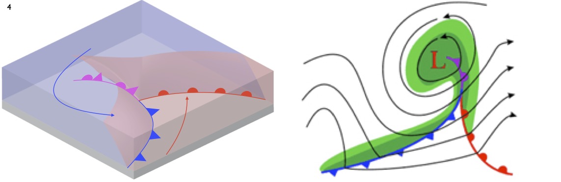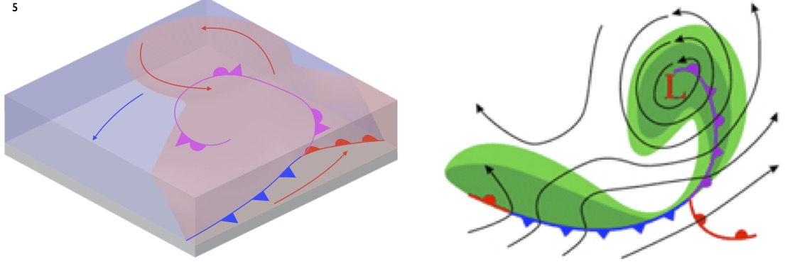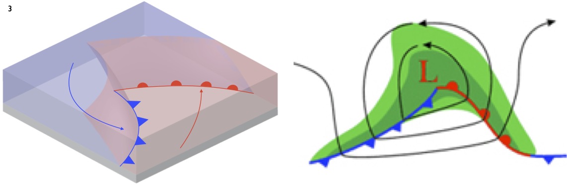 These rules come from consideration of the conditions in a low pressure system - the surface winds will blow close the the isobars, whereas the high-level jet-stream winds will blow west to east over the top of the system.