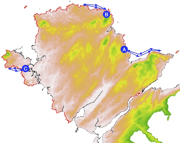 The map below show the island of Anglesey with elevation shown (green areas are ~150m) and cliffs shown as red stretches of coastline.