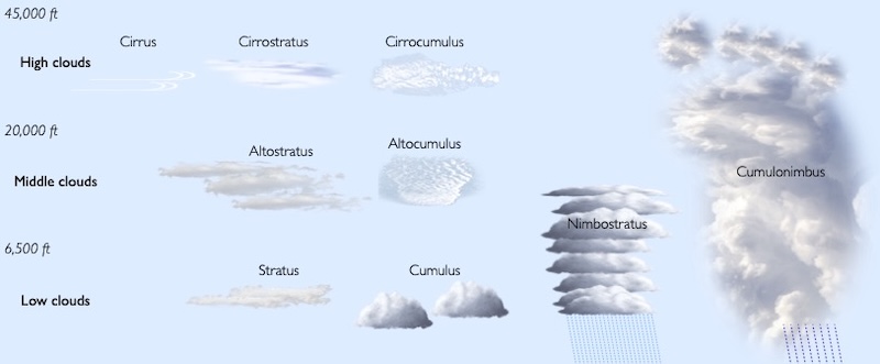 How high they are - low clouds form below ~6,500 feet, middle clouds from 6,500-23,000 feet and high clouds from 16,000 to 43,000 feet.