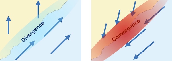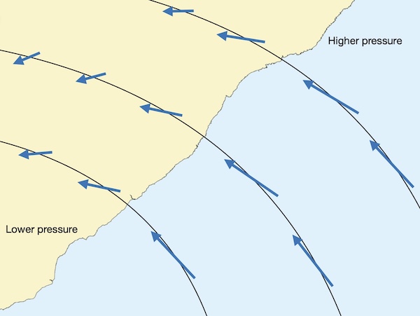 If the wind is blowing along a coastline, or slightly onshore, with the land on its left, the wind will tend to turn to the left as it blows onto the shore. The result is a zone of diverging wind over the coast, resulting in lighter winds. If the wind is blowing along the coast, or slightly offshore, with the land on its right, the wind will turn right as it blows offshore. The wind will hence converge and increase in strength near the coastline.