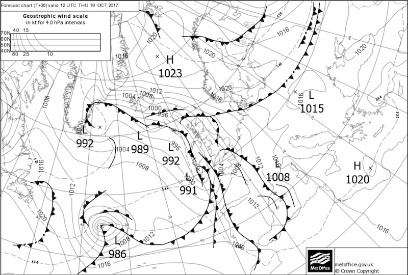 We then expect Cornwall to be hit by Low 986. Low pressure systems often move in a direction parallel to the isobars in the warm sector, so the center of the system will probably pass to the north of Cornwall. The system is currently an open wave low pressure (no occlusion), so it is reasonable to expect it to deepen as it approaches the UK.