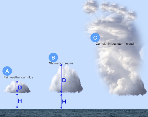 With these fair weather clouds (A in the diagram above), the depth of the cloud (D) is less than the height of the cloud (H).