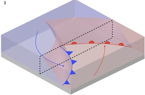 Further movement of the warm sector over the cold air mass causes some of the warm air to be lifted entirely off the ground.This is know as ‘occlusion’. On synoptic charts, an occluded front is drawn under this elevated warm air. It is marked with both semicircles and triangles and sometimes shown in purple. Once occlusion occurs, the depression will typically not reduce in pressure much further.