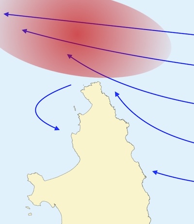 When the wind blows nearly parallel to the coastline, this can have interesting effects.