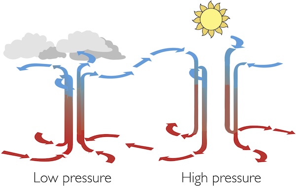 Even in the fair weather caused by high pressure systems, there may be some clouds in the sky. As the sun shines and heats the surface of the earth, the air above the warm surfaces warms and starts rising. This warm rising air often contains moisture which condenses and forms clouds as it rises. The resulting puffy cotton-wool like clouds that form in the blue sky are known as ‘fair weather cumulus clouds’.
