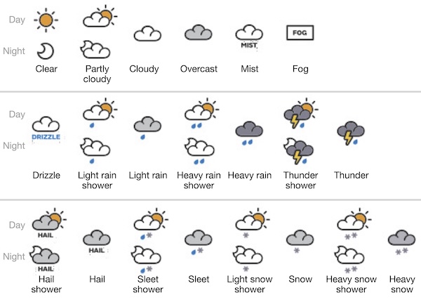 Many forecasts use symbols to describe the weather. These will vary a little between forecasts (so check!), but they’re likely to be similar to those used by the UK Met Office, shown below