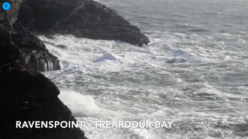 A force 5 wind (20 knots) is blowing from the west-north-west across Trearddur Bay on Anglesey: