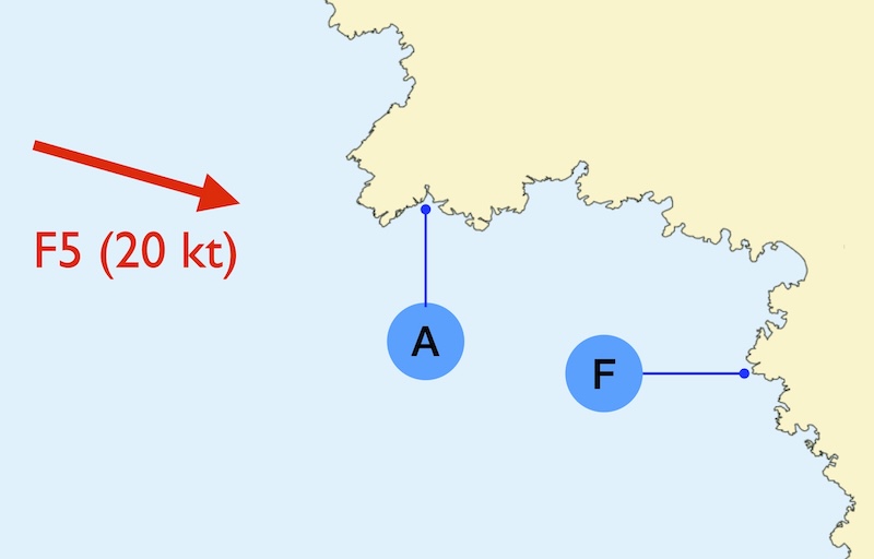 At point F, there is no shelter at all. To the west of Anglesey, there is no land until the coast of Ireland, almost 100 km upwind. We expect to feel the full force of the force 5 wind, and rough seas. Here’s a photo taken at point F looking south in these conditions: